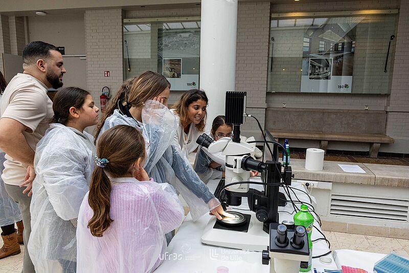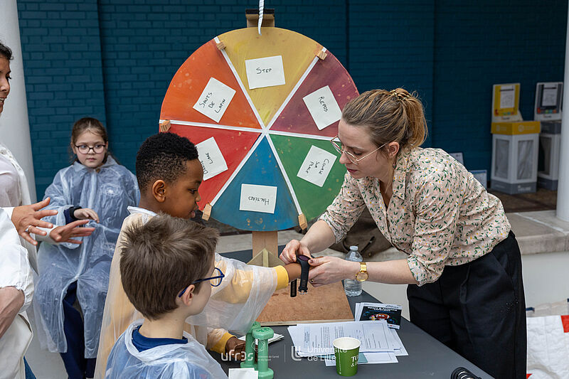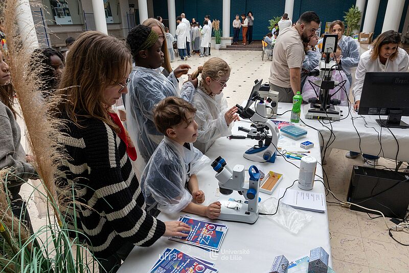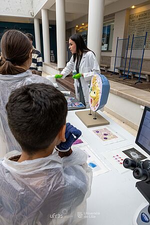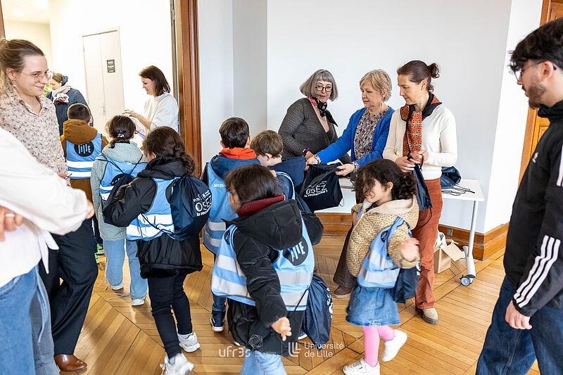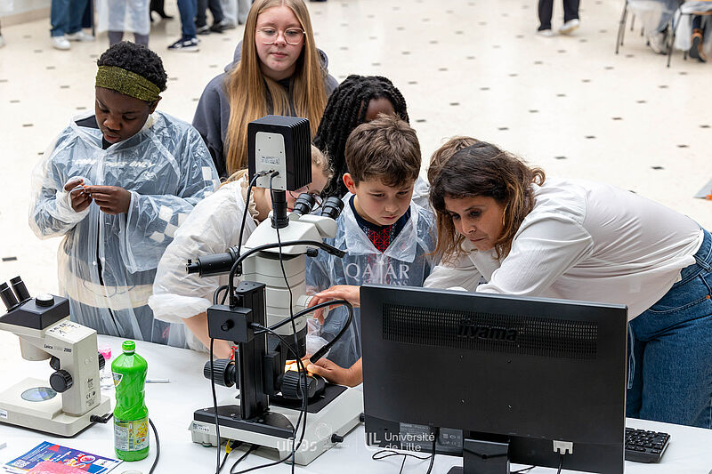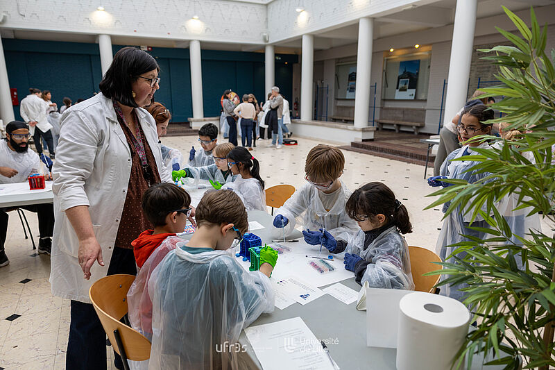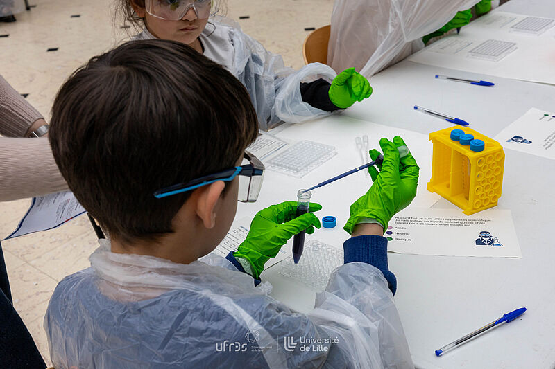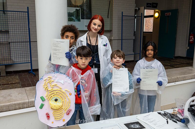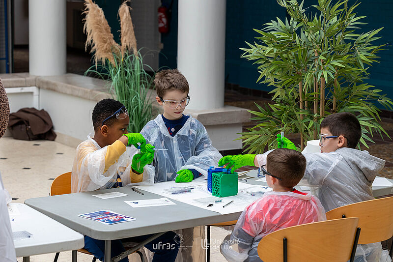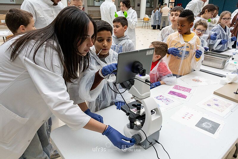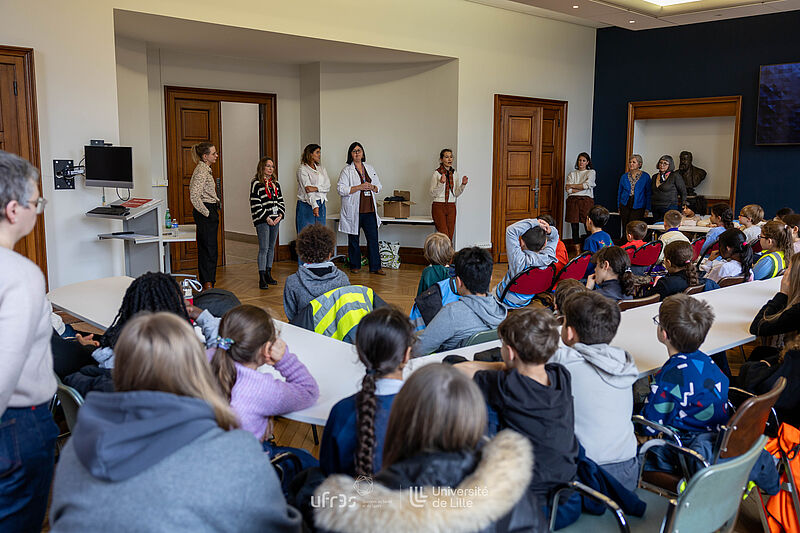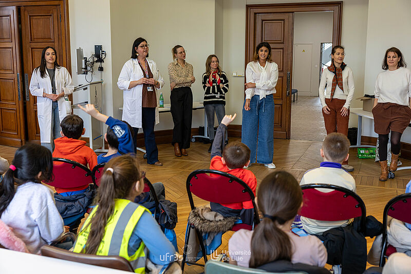 Au sein de l’UFR3S, cette journée a été organisée par quatre femmes scientifiques accompagnées de doctorantes de leurs laboratoires : Muriel Pichavant, Meryem Tardivel, Agathe Anthierens, Sarah Gabut, Marine Nouvel, Emeline Driencourt, Sirine B. et Charlotte Dufaye. Ce jeudi 12 février, elles ont reçu 37 enfants des centres de loisir de Lille pour leur faire découvrir de manière ludique le métier de chercheur(se).