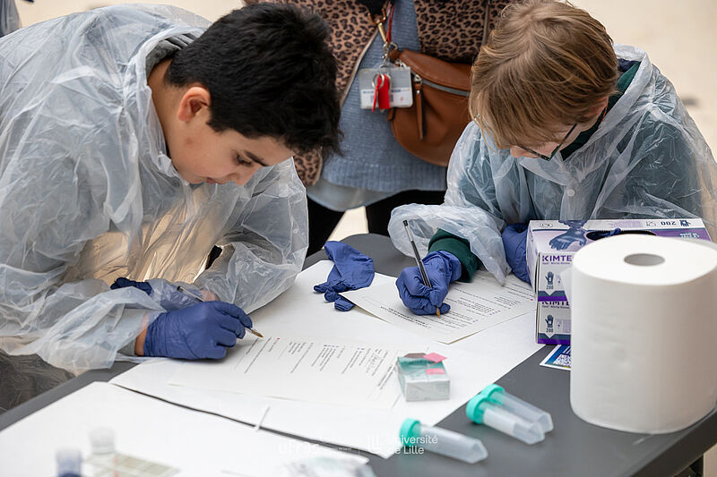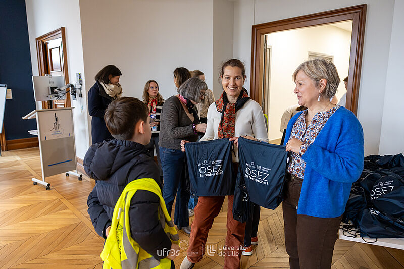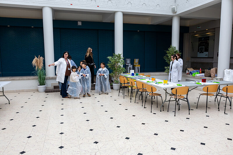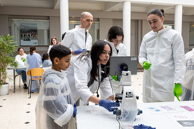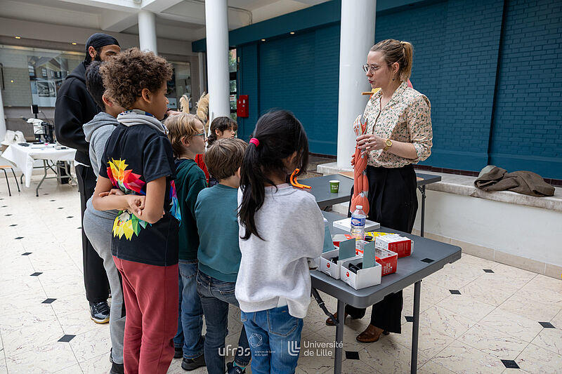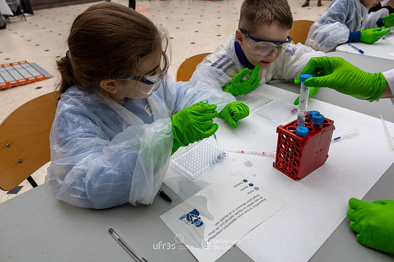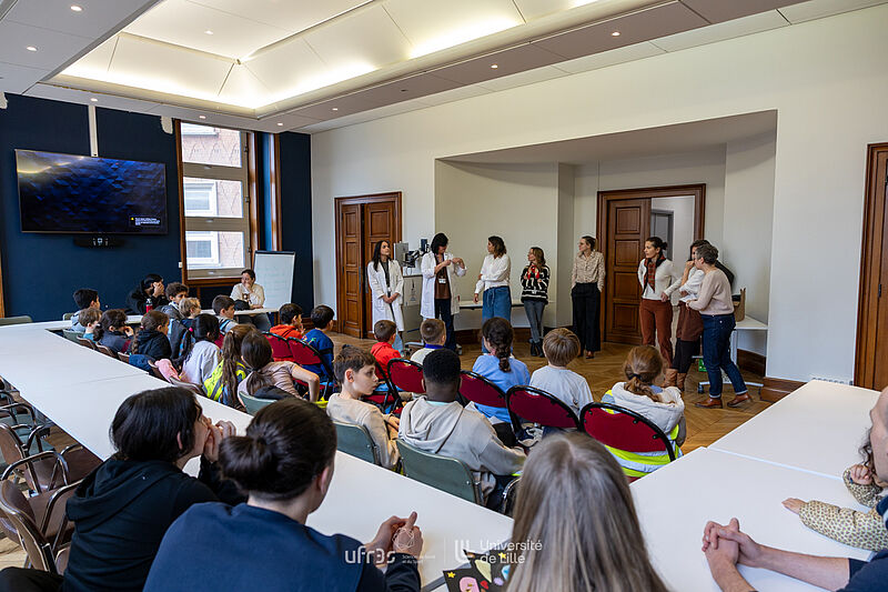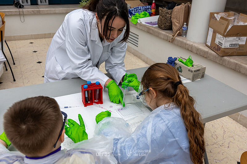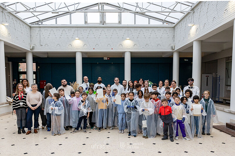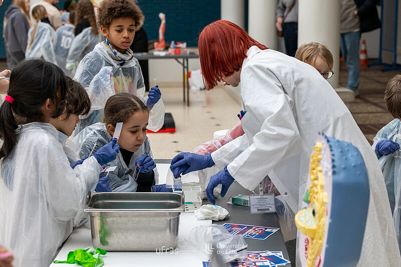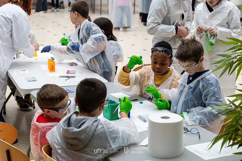 Au sein de l’UFR3S, cette journée a été organisée par quatre femmes scientifiques accompagnées de doctorantes de leurs laboratoires : Muriel Pichavant, Meryem Tardivel, Agathe Anthierens, Sarah Gabut, Marine Nouvel, Emeline Driencourt, Sirine B. et Charlotte Dufaye. Ce jeudi 12 février, elles ont reçu 37 enfants des centres de loisir de Lille pour leur faire découvrir de manière ludique le métier de chercheur(se).