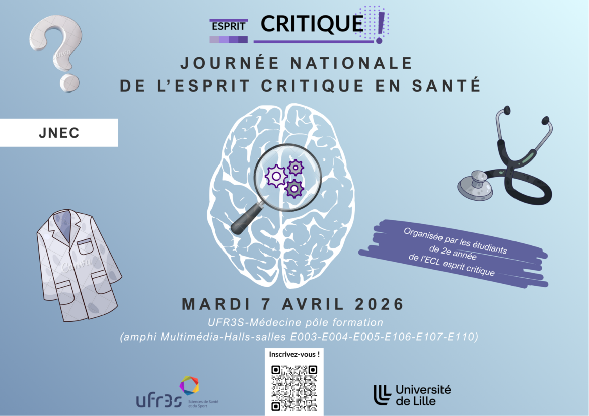 Les enseignants et les étudiants en 2e année de médecine engagés dans l’ECL esprit critique co-organisent la Journée Nationale de l’Esprit Critique à l’UFR3S. Venez développer votre esprit critique et affûter votre analyse de l’information !