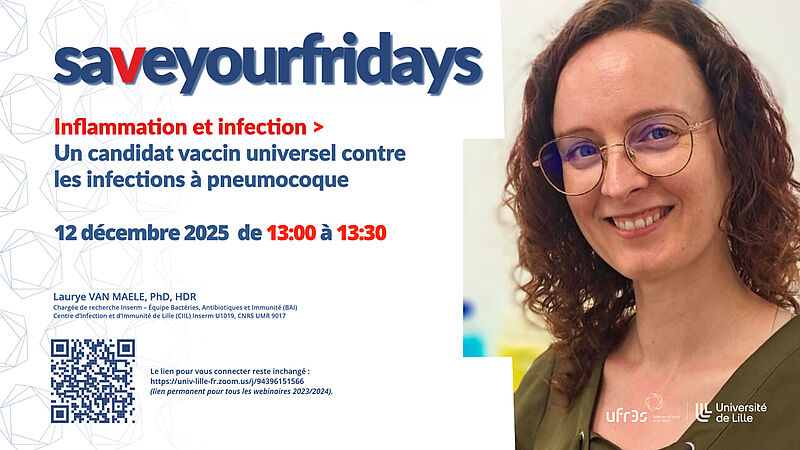Le bureau de la recherche organise des animations scientifiques hebdomadaires ayant pour objectif de valoriser la recherche et de communiquer sur les avancées en biologie-santé du site Lillois. Ces webinaires, intitulés « Save Your Fridays », ont lieu tous les vendredis de 13h à 13h30. Les webinaires accessibles à tous permettent aux unités de recherche impliquées dans les 11 thématiques de se présenter (5min) et d’effectuer une présentation vulgarisée de leurs travaux de recherche (15min) qui est suivie d’échanges questions/réponses (10min).