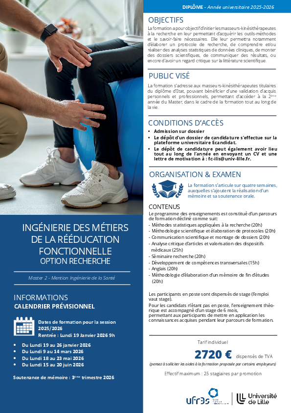 La formation a pour objectif d’initier les masseurs-kinésithérapeutes à la recherche en leur permettant d’acquérir les outils-méthodes et le savoir-faire nécessaires. Elle leur permettra notamment d’élaborer un protocole de recherche, de comprendre et/ou réaliser des analyses statistiques de données cliniques, de monter des dossiers scientifiques, de communiquer des résultats, ou encore d’avoir un regard critique sur la littérature scientifique.