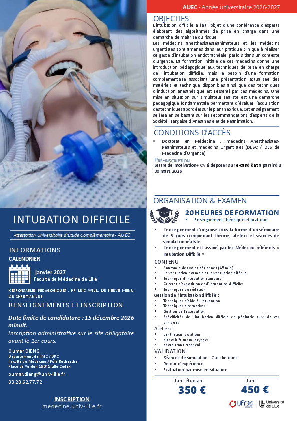 Les médecins anesthésistesréanimateurs et les médecins urgentistes sont amenés dans leur pratique clinique à réaliser ce geste d’intubation endotrachéale, parfois dans un contexte d’urgence. La formation initiale de ces médecins donne une introduction pédagogique aux techniques de prise en charge de l’intubation difficile, mais le besoin d’une formation complémentaire associant une présentation actualisée des matériels et technique disponibles ainsi que des techniques d’induction anesthésique est ressenti par ces médecins. Une mise en situation sur simulateur réaliste est une démarche pédagogique fondamentale permettant d’évaluer l’acquisition des techniques abordées sur le plan théorique. Cet enseignement se fera en se basant sur les recommandations d’experts de la Société Française d'Anesthésie et de Réanimation.