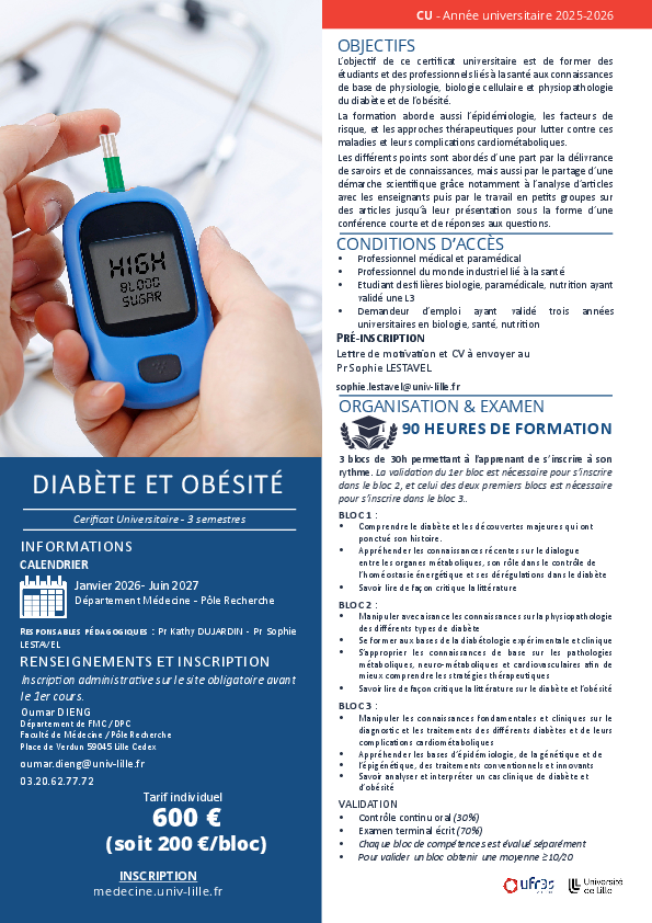 L’objectif de ce certificat universitaire est de former des étudiants et des professionnels liés à la santé aux connaissances de base de physiologie, biologie cellulaire et physiopathologie du diabète et de l’obésité.