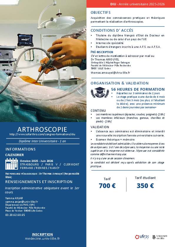 Acquisition des connaissances pratiques et théoriques permettant la réalisation d’arthroscopies.