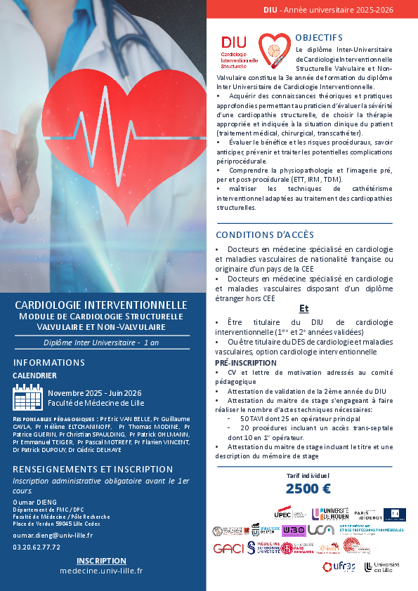 Le diplôme Inter-Universitaire de Cardiologie Interventionnelle Structurelle Valvulaire et Non-Valvulaire constitue la 3e année de formation du diplôme Inter Universitaire de Cardiologie Interventionnelle.