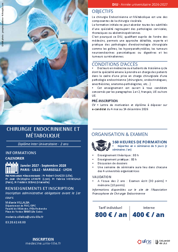 Compte tenu de l’importance actuelle que connaît la chirurgie endocrinienne et métabolique, la création d’une formation approfondie est indispensable tant pour l’acquisition des connaissances théoriques que pour la formation pratique et spécifiquement chirurgicale.