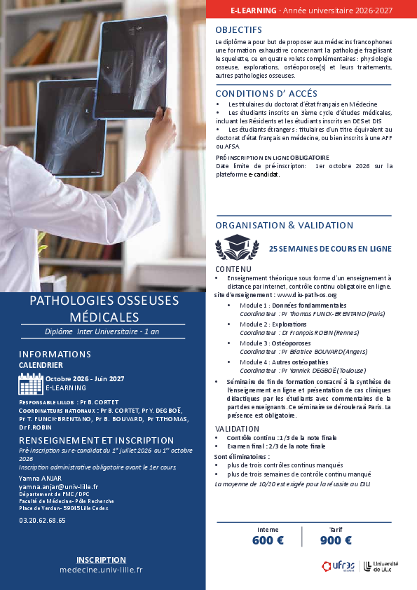 Le diplôme a pour but de proposer aux médecins francophones une formation exhaustive concernant la pathologie fragilisant le squelette, ce en quatre volets complémentaires : physiologie osseuse, explorations, ostéoporose(s) et leurs traitements, autres pathologies osseuses.