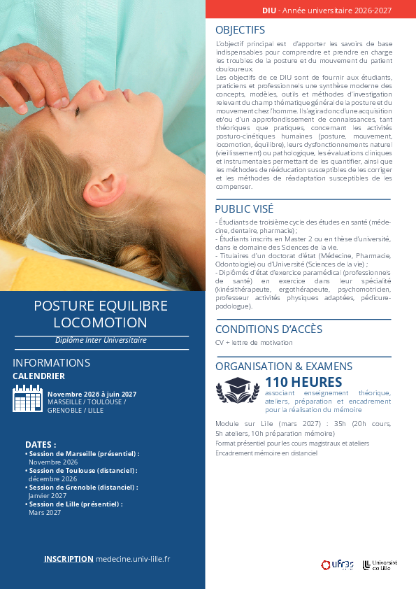Les objectifs de ce DIU sont de fournir aux étudiants, praticiens et professionnels une synthèse moderne des concepts, modèles, outils et méthodes d’investigation relevant du champ thématique général de la posture et du mouvement chez l’homme. Il s’agira donc d’une acquisition et/ou d’un approfondissement de connaissances, tant théoriques que pratiques, concernant les activités posturo-cinétiques humaines (posture, mouvement, locomotion, équilibre), leurs dysfonctionnements naturel (vieillissement) ou pathologique, les évaluations cliniques et instrumentales permettant de les quantifier, ainsi que les méthodes de rééducation susceptibles de les corriger et les méthodes de réadaptation susceptibles de les compenser.
