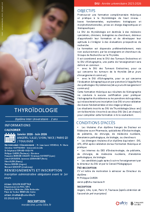 Les étudiants inscrits au DIU de Thyroïdologie (deux ans) ont la liberté de s’inscrire à ces deux DIU (de 1 an chacun) pour compléter cette formation si ils le souhaitent.