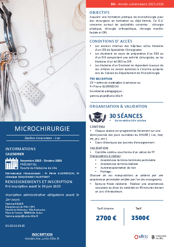 Acquérir une formation pratique de microchirurgie pour des chirurgiens en formation ou déjà formés. Ce D.U. concerne surtout les spécialités suivantes : chirurgie plastique, chirurgie orthopédique, chirurgie maxillo-faciale et ORL.
