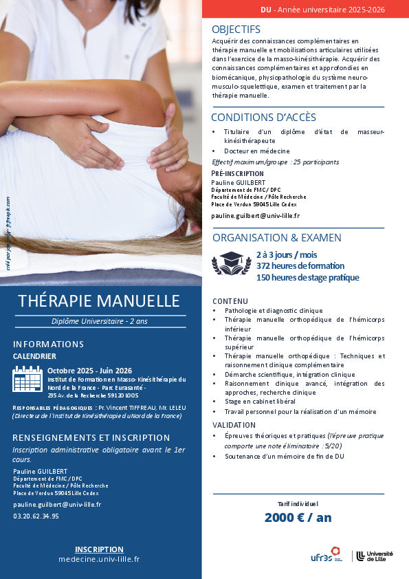 Mettre à jour les connaissances en thérapie manuelle et mobilisations articulaires utilisées dans l’exercice de la masso-kinésithérapie Acquérir des connaissances complémentaires et approfondies en biomécanique, physiopathologie du système neuro-musculosquelettique, examen et traitement par la thérapie manuelle.