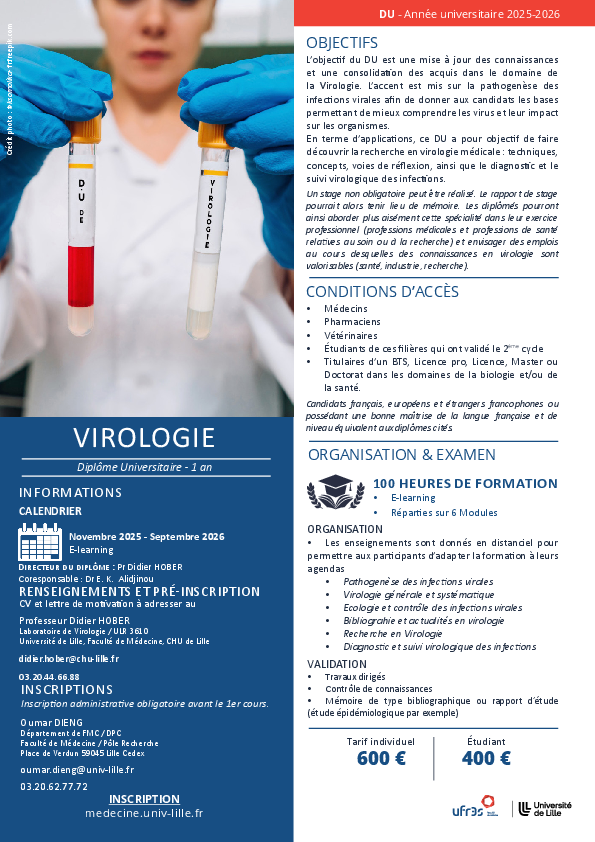 L’objectif du DU est une mise à jour des connaissances et une consolidation des acquis dans le domaine de la Virologie. L’accent est mis sur la pathogenèse des infections virales afin de donner aux candidats les bases permettant de mieux comprendre les virus et leur impact sur les organismes.