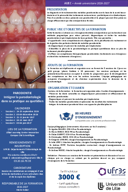 - d’affiner vos compétences thérapeutiques parodontales (traitements non chirurgicaux et abord des traitements chirurgicaux).