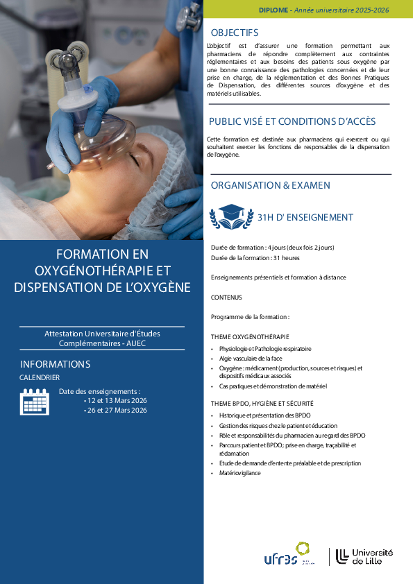L’objectif est d’assurer une formation permettant aux pharmaciens de répondre complètement aux contraintes réglementaires et aux besoins des patients sous oxygène par une bonne connaissance des pathologies concernées et de leur prise en charge, de la réglementation et des Bonnes Pratiques de Dispensation, des différentes sources d’oxygène et des matériels utilisables.