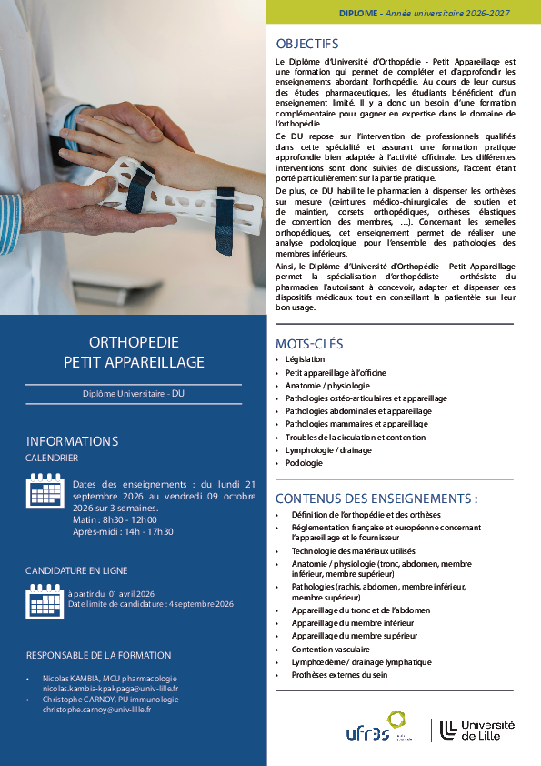 Ainsi, le Diplôme d’Université d’Orthopédie - Petit Appareillage permet la spécialisation d’orthopédiste - orthésiste du pharmacien l’autorisant à concevoir, adapter et dispenser ces dispositifs médicaux tout en conseillant la patientèle sur leur bon usage.