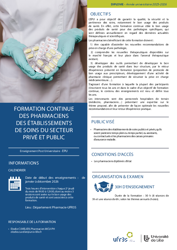 L’objectif est de garantir la qualité, la sécurité et la pertinence des soins, notamment le bon usage des produits de santé. Cette formation continue cible le bon usage des produits de santé pour des pathologies spécifiques, qui sont définies annuellement en regard des dernières actualités thérapeutiques et scientifiques.