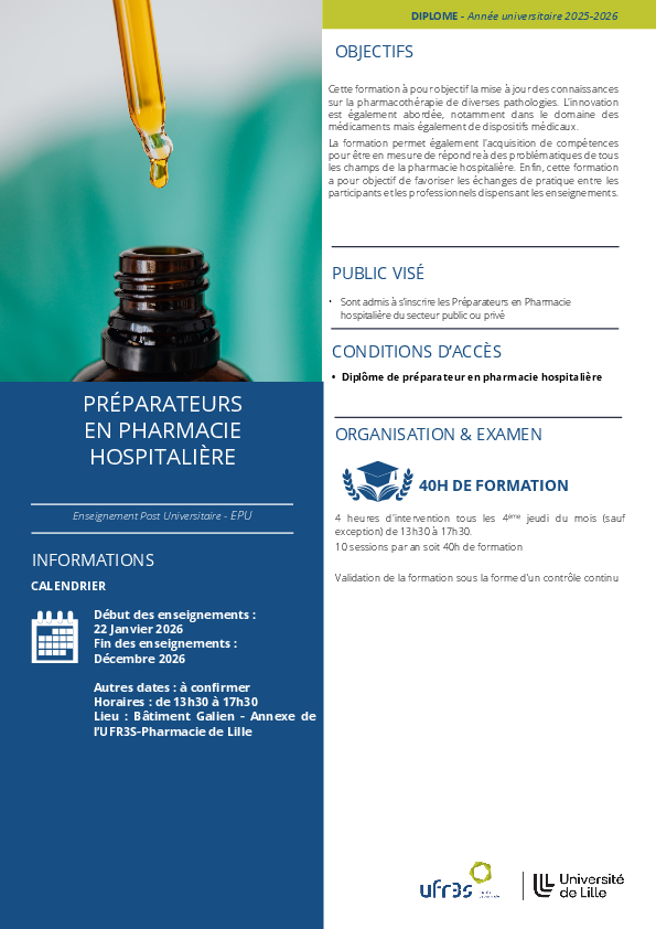 Cette formation a pour objectif la mise à jour des connaissances sur la pharmacothérapie de diverses pathologies. L'innovation est également abordée, notamment dans le domaine des médicaments mais également de dispositifs médicaux.