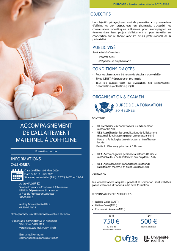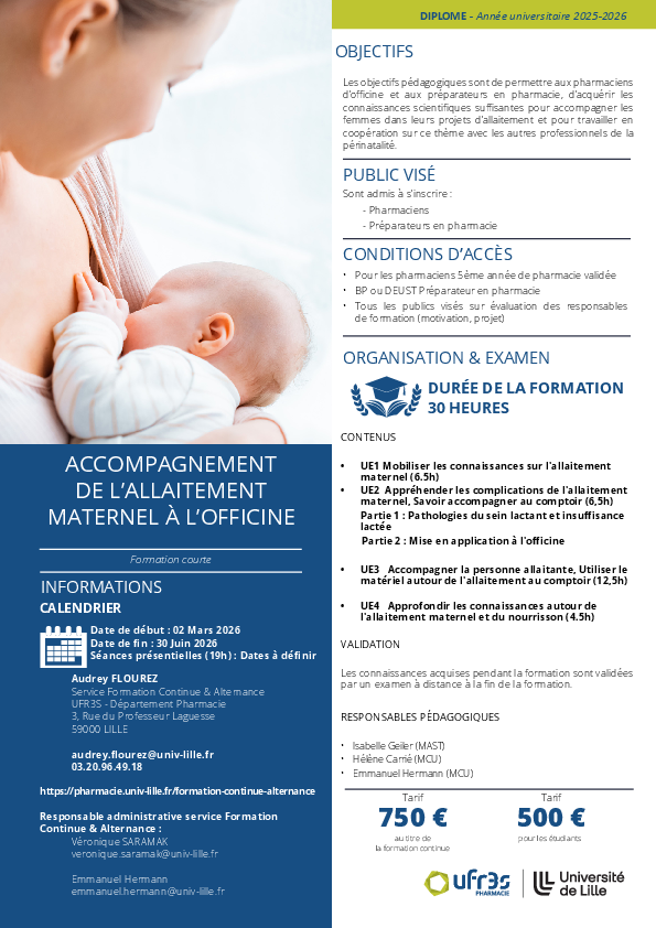 Les objectifs pédagogiques sont de permettre aux pharmaciens d’officine et aux préparateurs en pharmacie, d’acquérir les connaissances scientifiques suffisantes pour accompagner les femmes dans leurs projets d’allaitement et pour travailler en coopération sur ce thème avec les autres professionnels de la périnatalité.