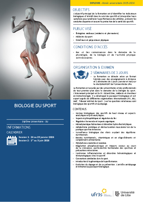 L’objectif principal de la formation est d’identifier les indicateurs biologiques d’intérêt dans le suivi des sportifs et interpréter leurs variations pour améliorer la performance des athlètes, prévenir les conduites dopantes et assurer la protection de la santé des sportifs.