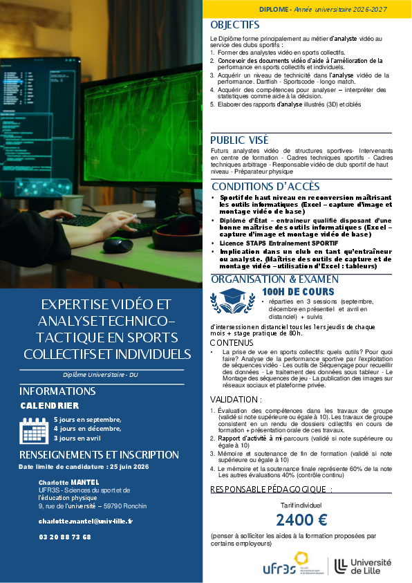 Le Diplôme forme principalement au métier d’analyste vidéo au service des clubs sportifs : concepteurs de projets didactiques audio visuels au service de l’analyse des sports collectifs et individuels :