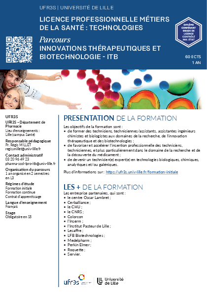 Le paysage de la R&D (Recherche & Développement) en Industrie Pharmaceutique a beaucoup évolué au cours des 10 dernières années. Un grand nombre de start-ups ou biotechs ont ainsi vu l’émergence et notamment autour d’Eurasanté à Lille. D’autre part, le besoin de compétences nouvelles et de personnels de plus en plus qualifiés capables de comprendre ces nouvelles technologies, est devenu une nécessité. La Licence Professionnelle mention Métiers de la santé : technologies - parcours Innovation thérapeutique et biotechnologies permet d’acquérir les compétences professionnelles utiles pour intégrer un laboratoire de recherche et de développement dans le domaine de l’innovation thérapeutique et des biotechnologies pharmaceutiques appliquées au médicament. Un grand nombre de professionnels participe aux enseignements ou à l’encadrement des apprentis.
